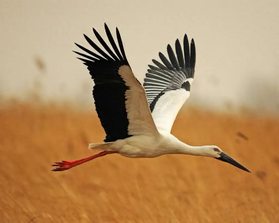 朱鹮展翅掠过澄净的天空