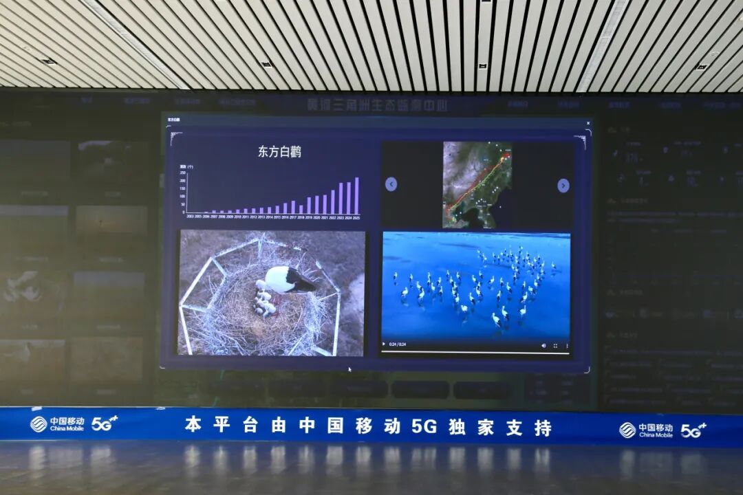 在这里,中国移动山东公司依托黄河三角洲生态监测平台,融合AI识别算法,实时识别鸟群种类、状态与分布,可视化追踪东方白鹳的迁徙轨迹、繁殖动态,为“鸟中大熊猫”筑起无形护盾。