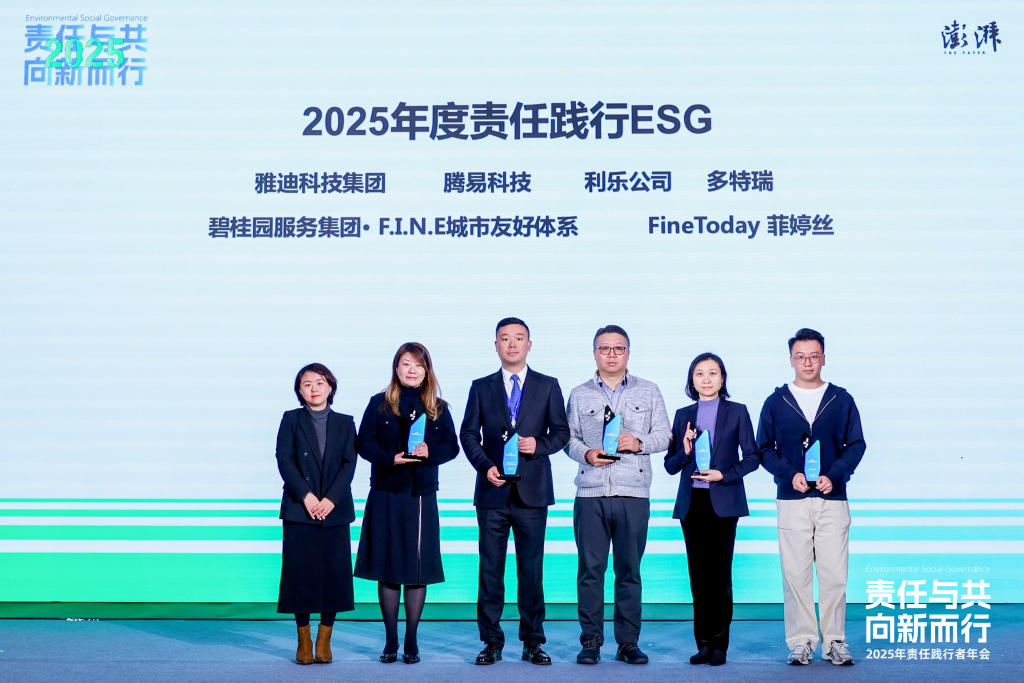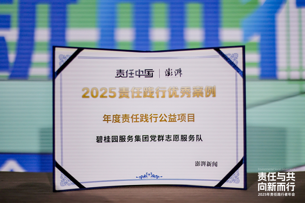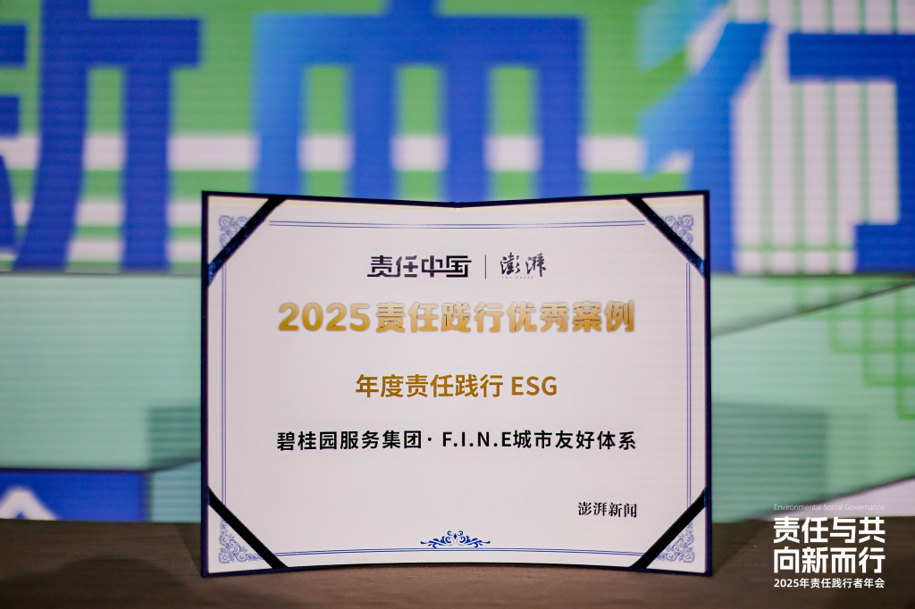 2025年澎湃责任践行者年会近日圆满落幕,年会以“责任与共,向新而行”为主题,汇聚了来自政府、学界、国际组织与企业界的众多嘉宾,共同探讨在全球气候变化背景下,企业如何通过践行ESG(环境、社会和治理)理念推动高质量发展。会上,碧桂园服务集团凭借其在绿色低碳转型与社会公益领域的系统性创新与扎实实践,一举斩获两项重磅荣誉。旗下天力商写业态的F·I·N·E城市友好体系荣获“年度责任践行ESG”,碧桂园服务党群志愿服务队被评为“年度责任践行公益项目”。双奖印证了碧桂园服务将可持续发展深度融入企业战略与日常运营,实现了商业价值与社会价值的同频共振。