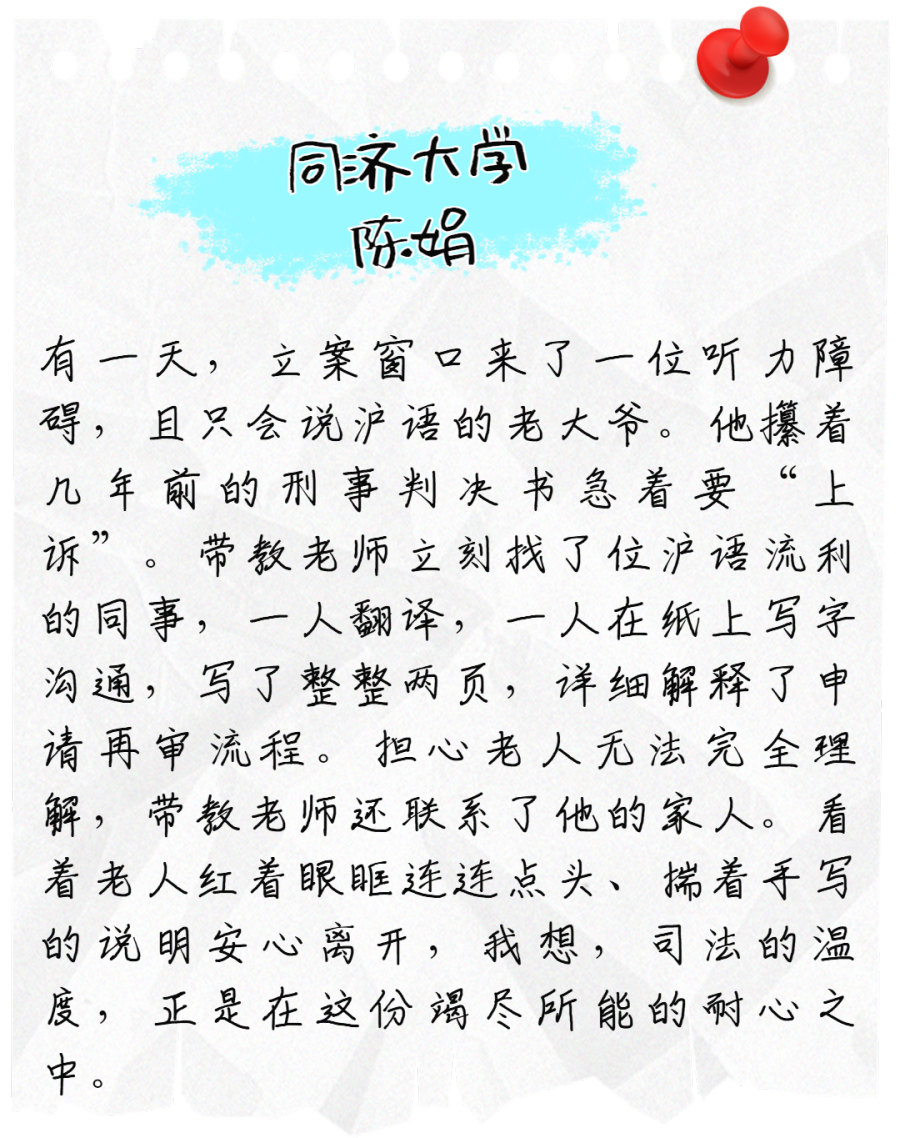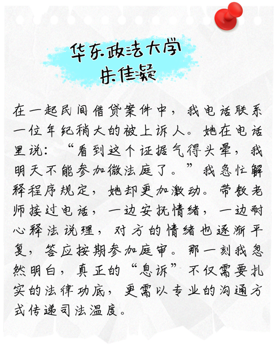 在每项任务中学习技能、精进本领;在每次沟通中认真感受、体悟价值;在所运用的每则法条中感受法律的关怀与温度。