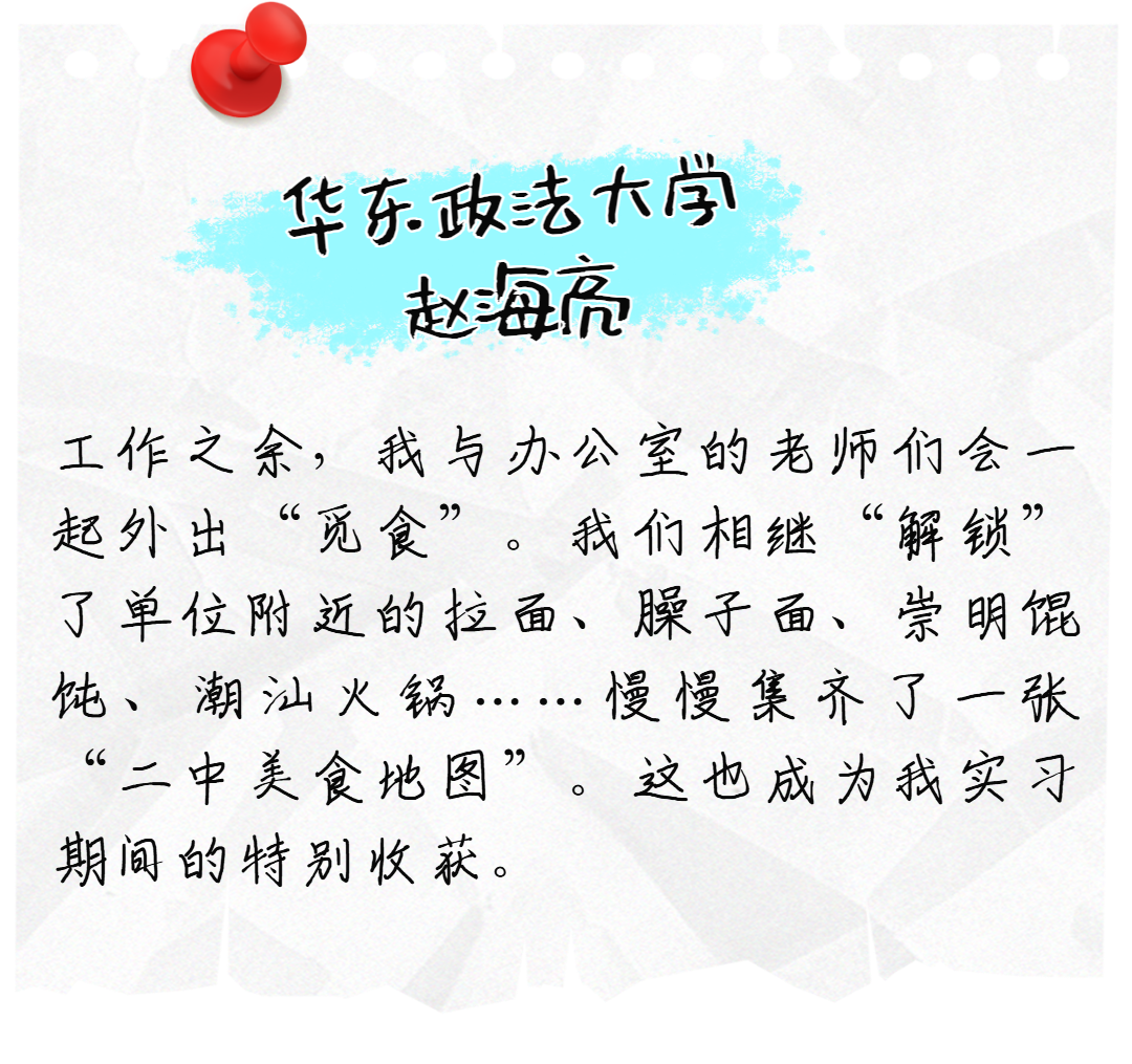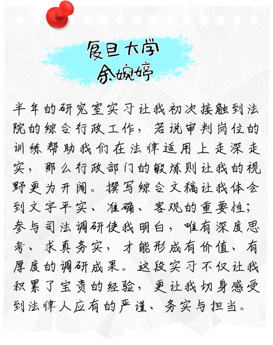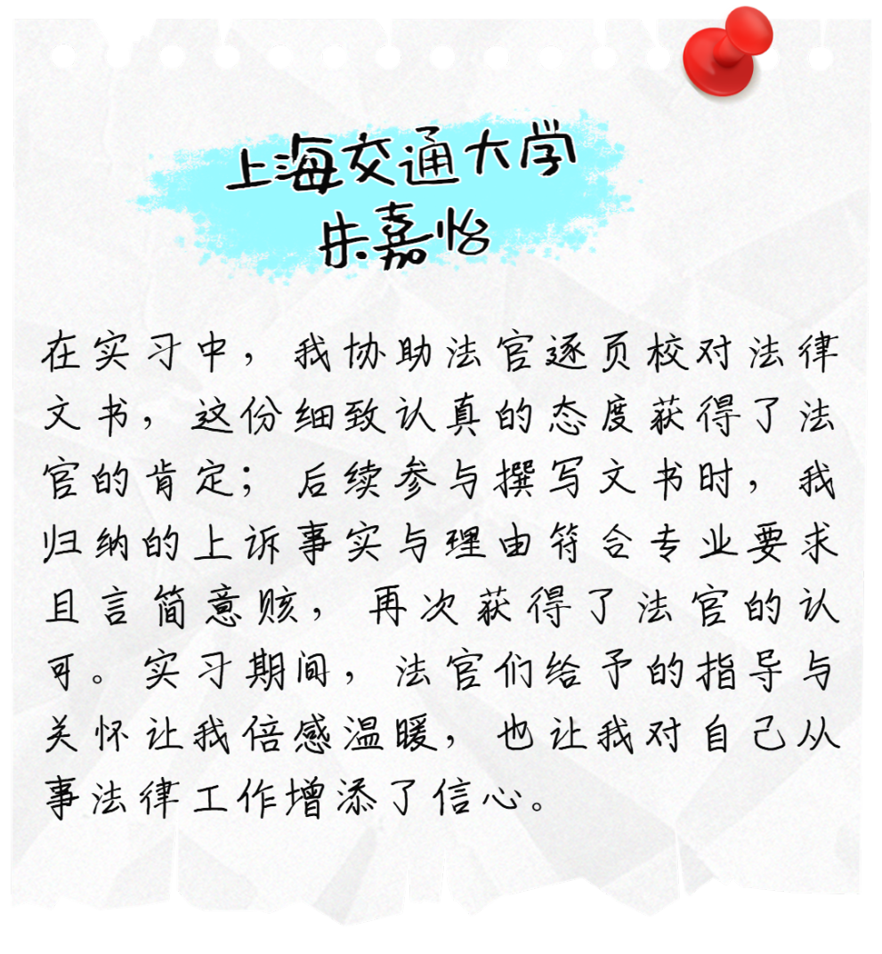 二中院的老师们都特别好,不论你在哪个部门,哪位老师带教,只要有认真的态度,一定会有所收获。六个月听起来很长,但时间真的一晃而过,这里为我们实习生提供了很好的平台,希望你们都能大展拳脚!