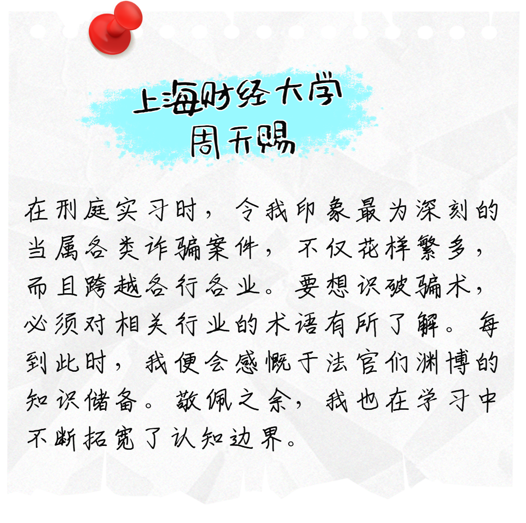 12月3日,上海二中院为第18期实习法律助理举办了一场别开生面的结业活动。活动中,来自8所高校的41位实习法律助理,将实习感受与对未来实习法律助理的寄语写在明信片上,并投入“时光信箱”。让我们一起看看他们都写了些什么吧。