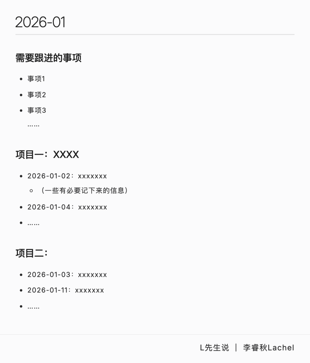 在年初的时候,新建一个笔记本,命名「2026」。然后在里面新建十二页笔记,分别命名为:2026-01、2026-02……每页笔记代表一个月。