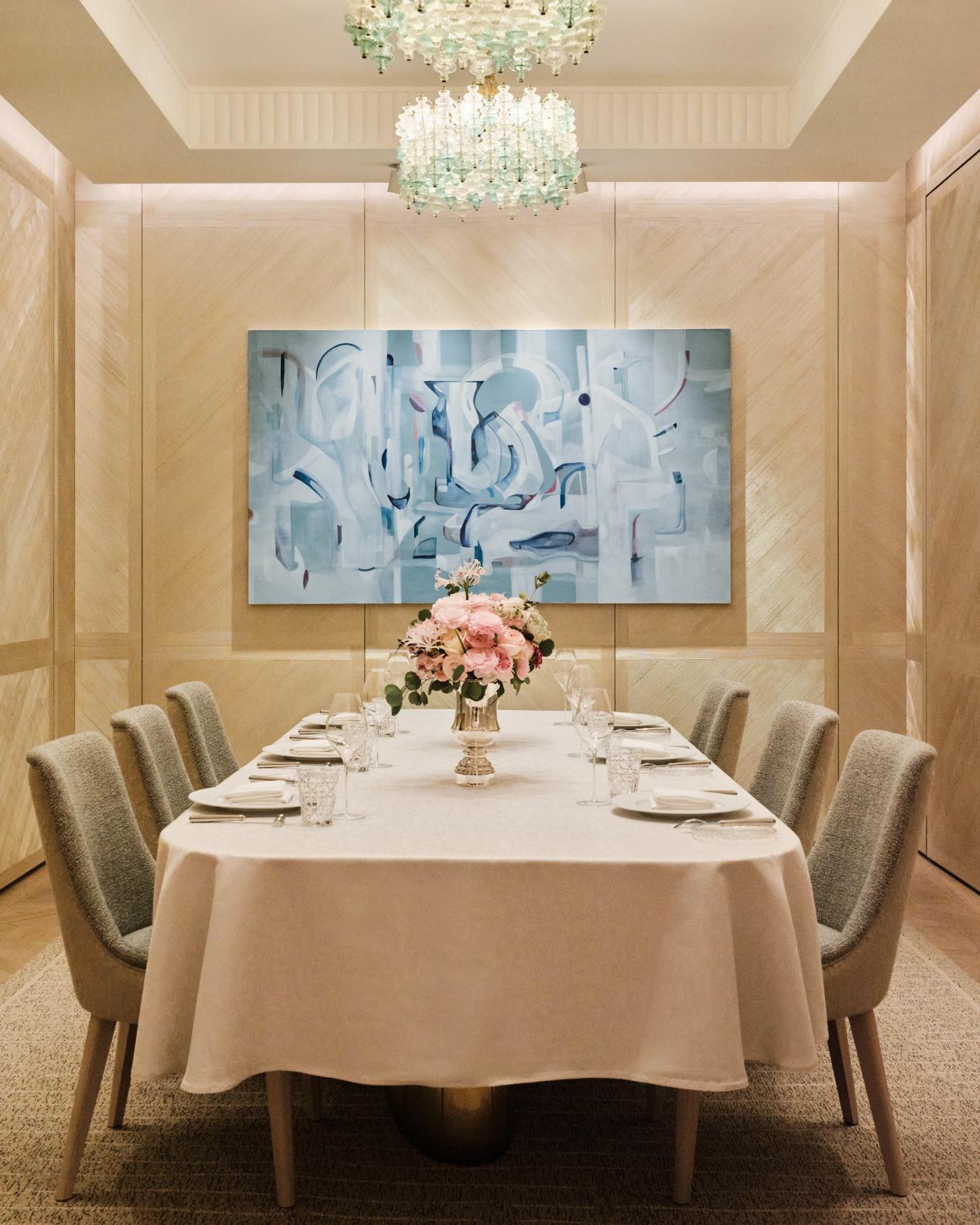 一张张黑白摄影作品,定格了迪奥先生打造的众多标志性廓形,而René Bouché的《餐桌旁的迪奥先生》(Monsieur Dior à table)复刻画则生动展现了迪奥先生所珍视的待客之道。一间私人包厢内陈设有Mathilde Denize的迷人画作,为这场联结北京与巴黎的全新感官旅程更添曼妙诗意。