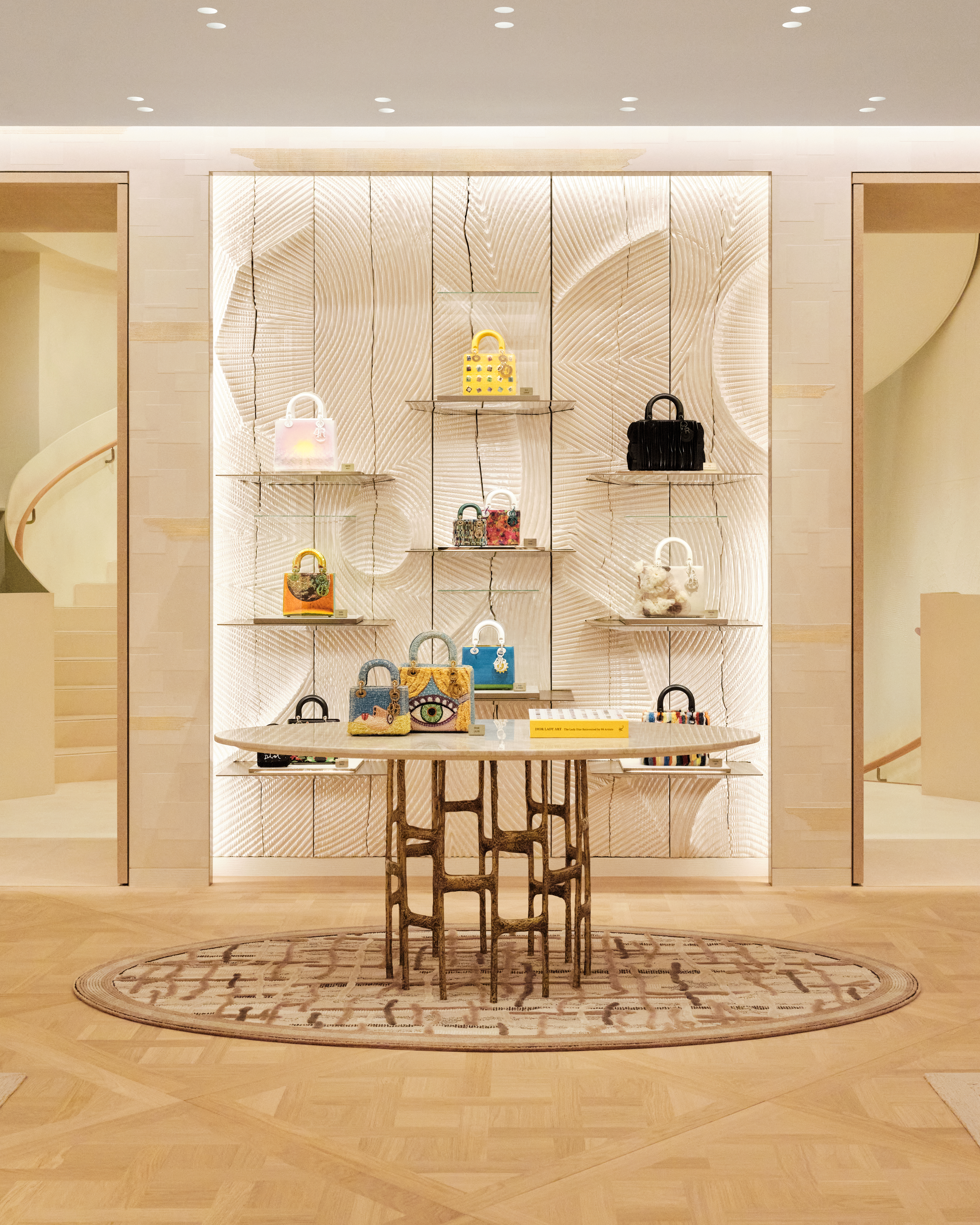 一个多元迪奥世界的探索之旅从一层开启:女士手袋、配饰与鞋履陈列于此;二层则荟萃女装成衣、珠宝及迪奥香氛世家典藏系列臻作。男装系列、腕表系列,以及Dior Maison家居系列作品亦呈献于其他空间。而每一处空间墙面皆由手工精心打造而成,风格独特:男装区域的珍珠母贝墙面闪耀着珠光晕彩,女装区域墙面则点缀着流转金色光泽的手作画框。