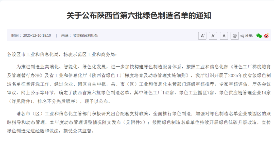 12月10日,陕西省工业和信息化厅公示了陕西省第六批绿色制造名单,高新区7家企业凭借在绿色生产、节能减排及可持续发展方面的突出表现,成功入选陕西省第六批绿色制造“绿色工厂”示范单位。