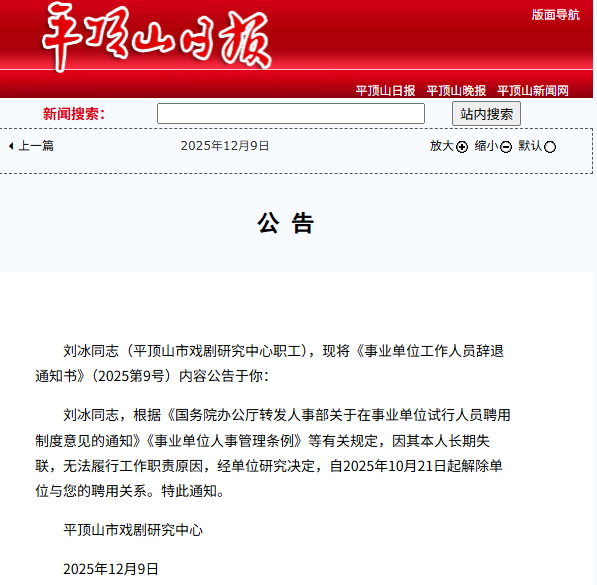 河南平顶山市戏剧研究中心近日在《平顶山日报》发布辞退公告称,刘冰同志(平顶山市戏剧研究中心职工)长期失联、无法履职,经单位研究决定,自2025年10月21日起解除单位与其的聘用关系。