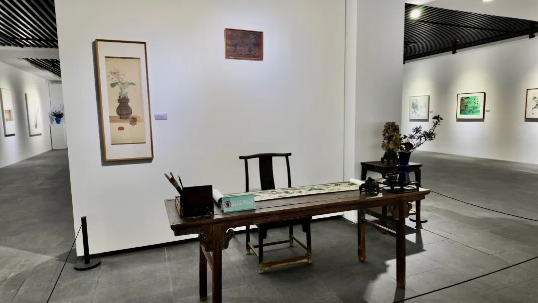 空间本身也成为叙事的参与者。现场还原了传统文人书房,古画、奇石、插花与线装书共同营造出可沉浸的雅集氛围。布展团队甚至在作品旁搭配了芦苇枯枝,让植物的真实质感与画中意象彼此呼应。