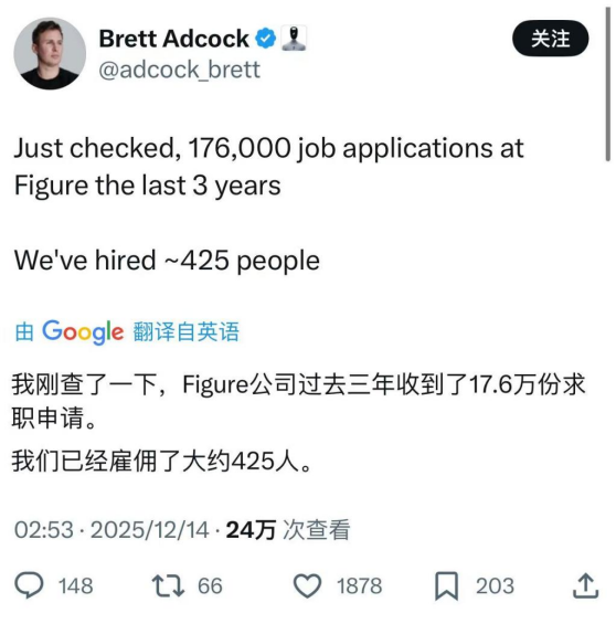 12月14日,Figure AI首席执行官布雷特·阿德考克(Brett Adcock)在其个人社交平台上公开表示,Figure AI自2022创立以来,收到过17.6万份简历,其中只有约425人被录用,录用率为0.24%。若将申请数量平均分配到Figure AI运营的年份——每年接近5.9万份申请,其录取率低于美国最难考入的大学。根据《美国新闻与世界报道》排名,加州理工学院的录取率最低,仅为3%。