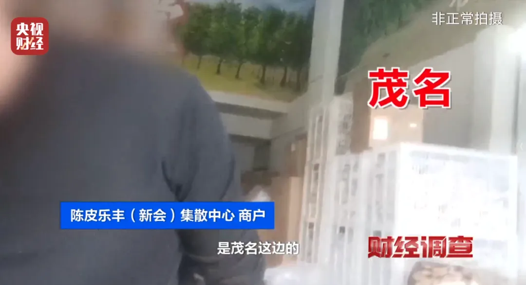 记者在广西浦北柑浦堂分拣仓库看到,大量标注“新会陈皮”“新会特产”的纸箱正打包“工艺皮”,这些广西陈皮每日批量发往广东新会,造假供需链路已成熟稳定。