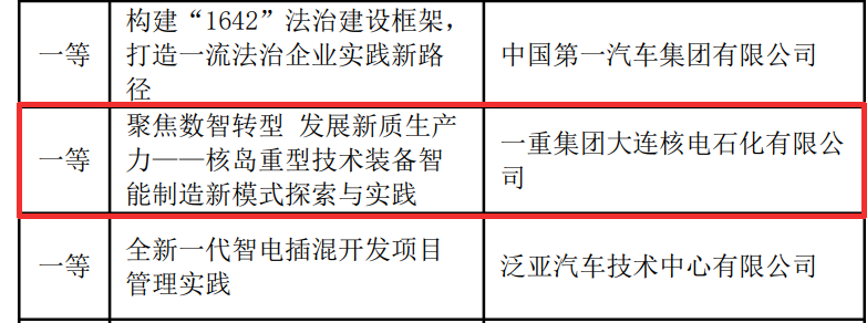 近日,2025年机械行业企业管理创新优秀成果奖榜单正式揭晓,中国一重申报的3项成果脱颖而出、全部获奖。一重核电石化成果荣获一等奖,集团公司科数部和一重天津重工的成果分获二等奖,彰显了公司在管理现代化变革中的卓越成效与行业引领力。