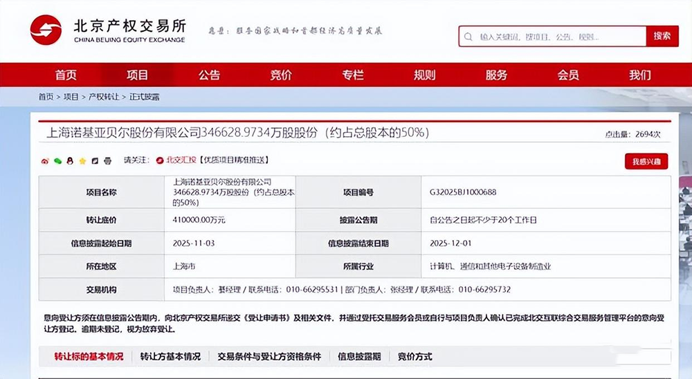 11月3日,北京产权交易所官网挂出诺基亚贝尔股权转让信息,华信邮电拟出让其持有的346628.9734万股股份,占公司总股本的50%,转让底价41亿元。