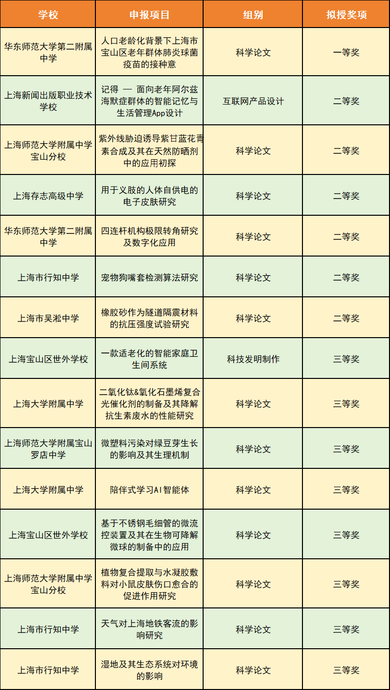 在科技创新赛道中,宝山学子表现尤为亮眼,共获15项奖项,其中:
