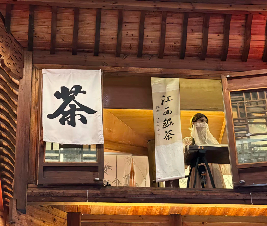 12月11日晚8时整,在万寿宫历史文化街区的“江西鲲茶”二楼,临街的窗户被推开。“00后”古筝乐手彭艺柔面覆轻纱,与笛子乐手一道,将一段经典广播主题曲演绎出别样的江南韵味。