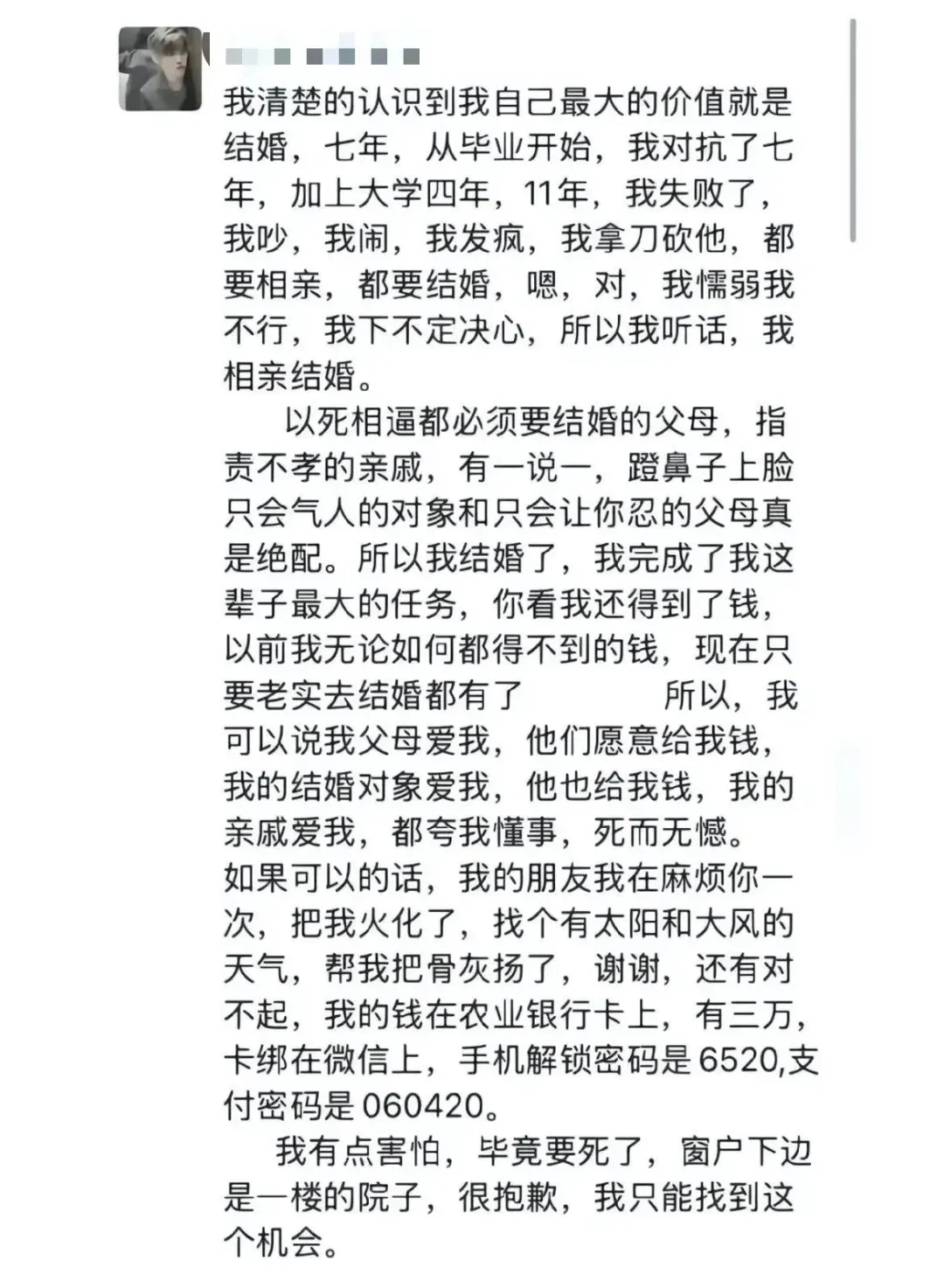 事发后,一条疑似当事人遗言的的朋友圈截图在网络流传,朋友圈内容显示,她一直在被父母逼婚。多位受访者向中国新闻周刊证实,该账号确系魏某本人。