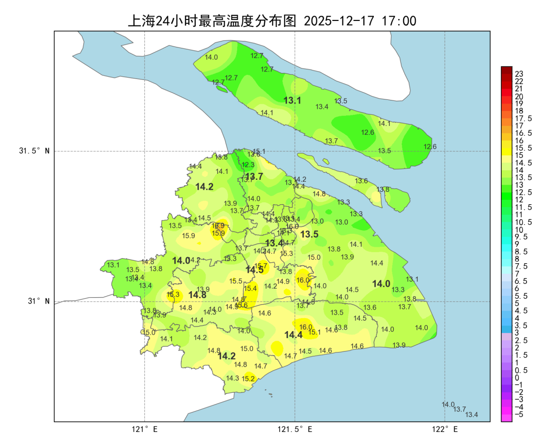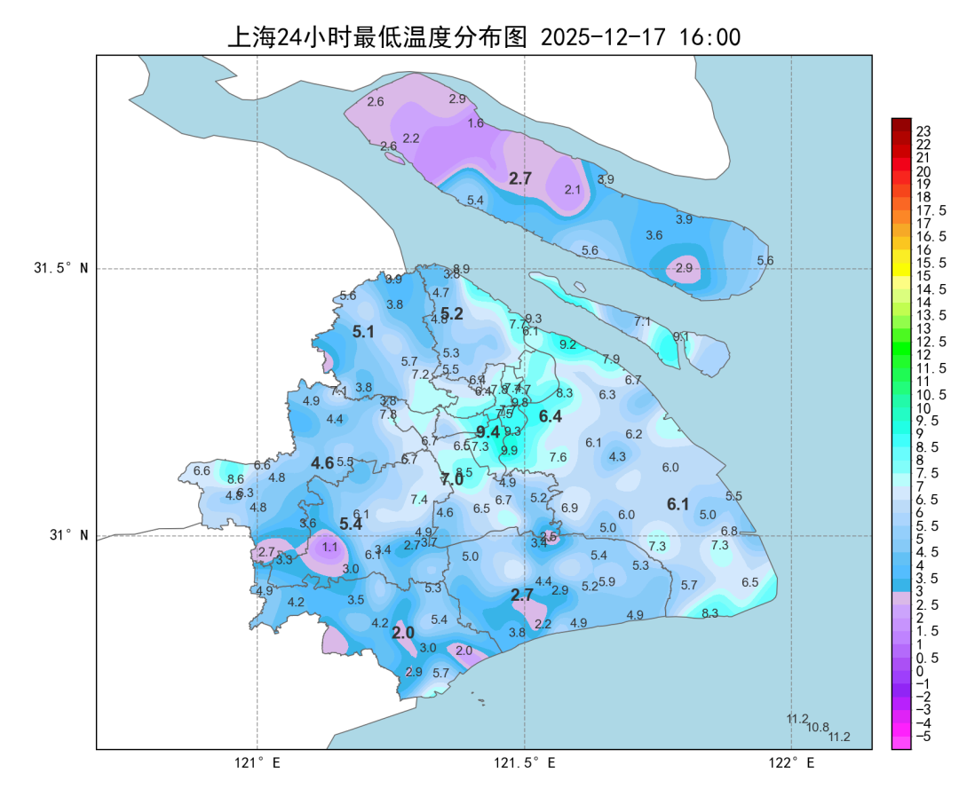 受辐射降温影响,今天早间全市最低气温城郊差异明显,市区徐家汇站9.4度,郊区大多在2~10度之间,金山2.0度为最低。受冷空气扩散影响,白天多云天气为主,午后天空渐渐打开,阳光露脸。最高气温较昨日小幅下降,全市在12~15度之间,市区徐家汇站13.4度。空气仍旧比较干燥。