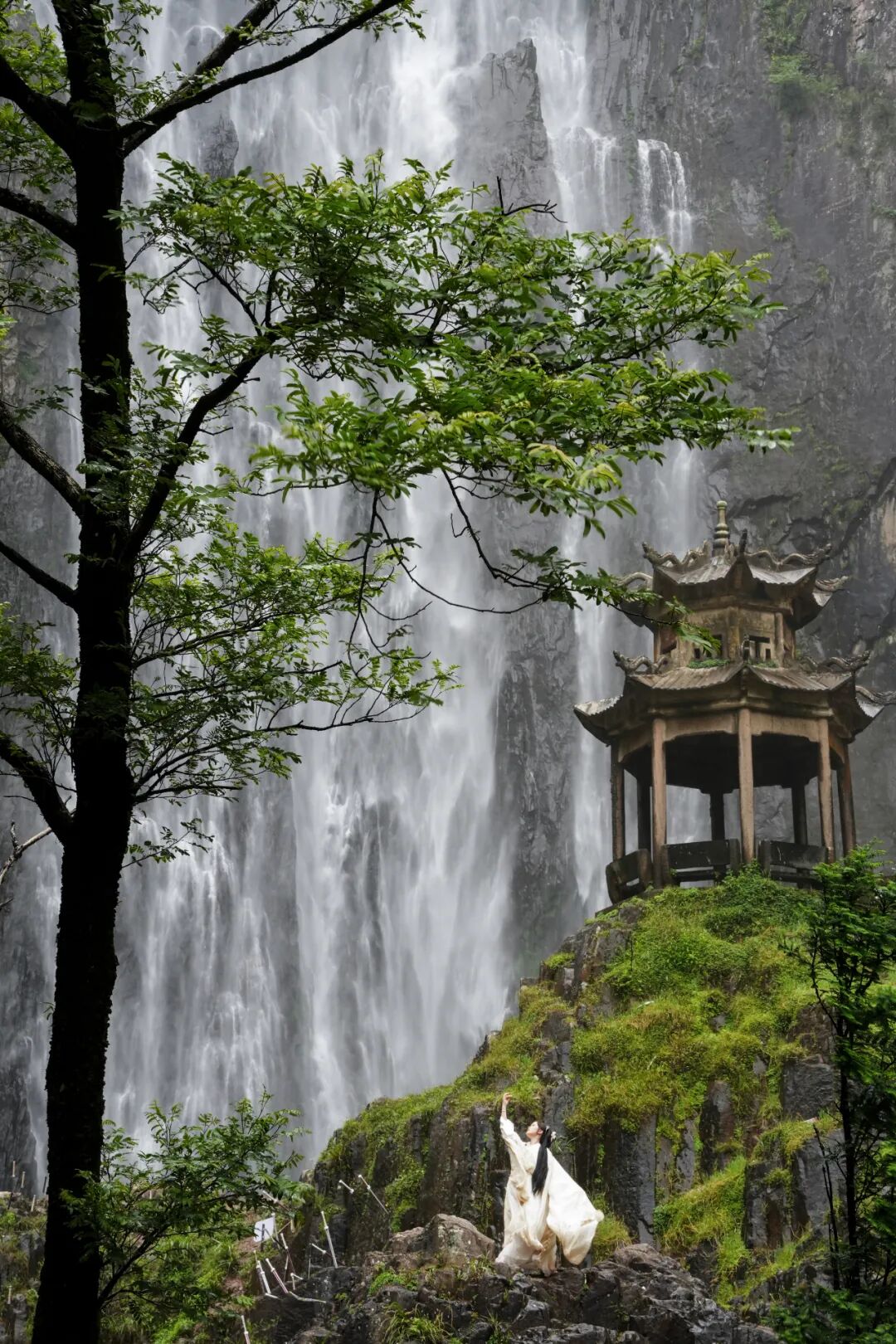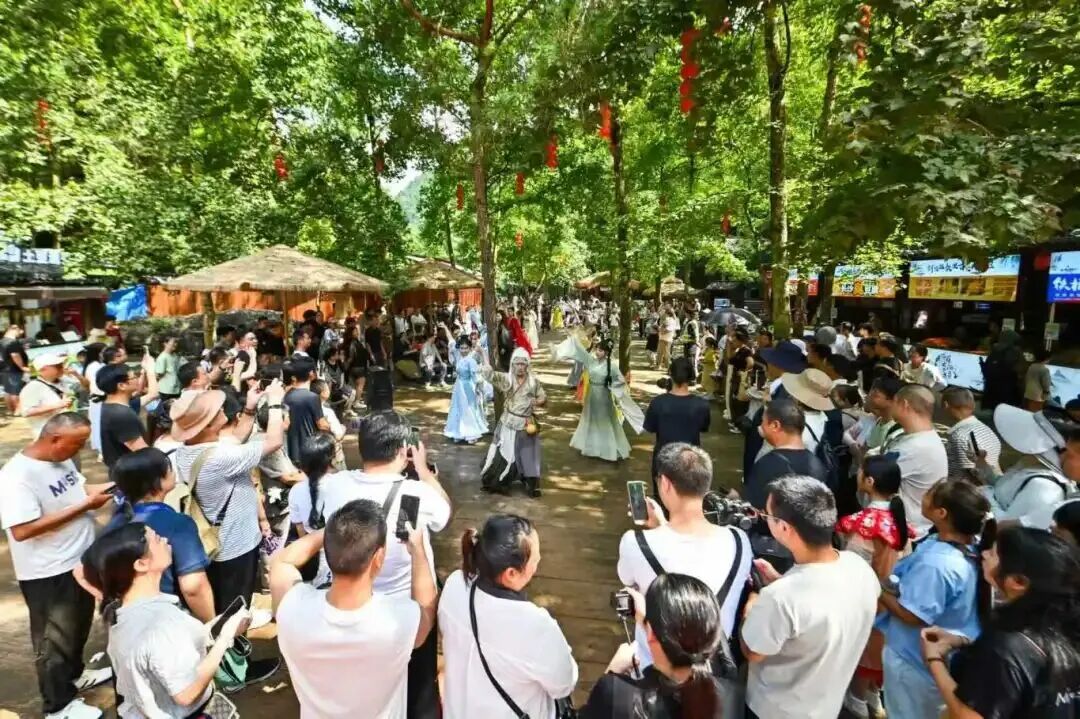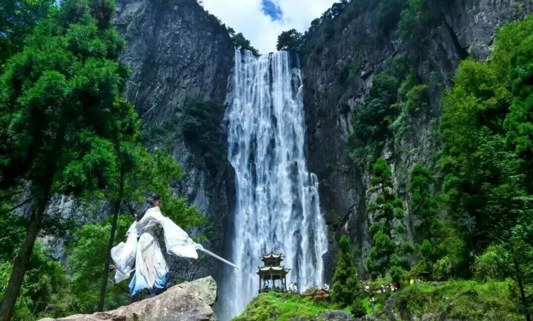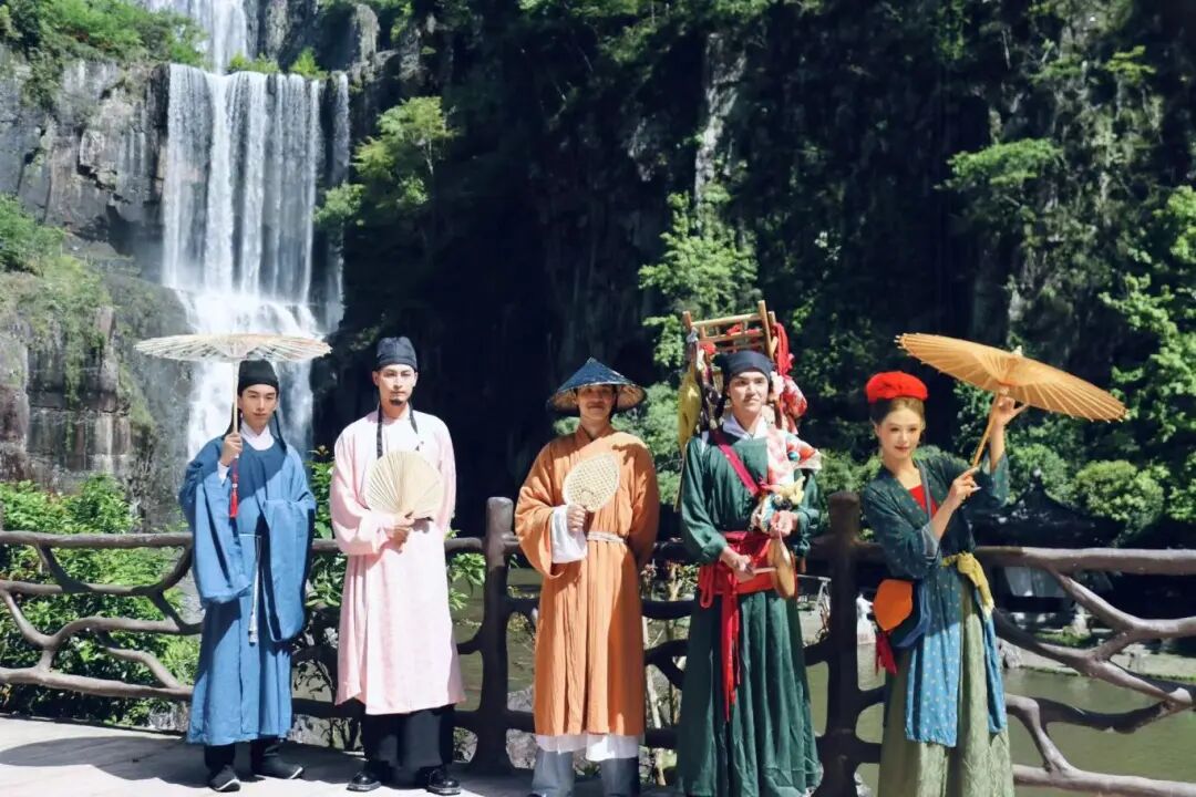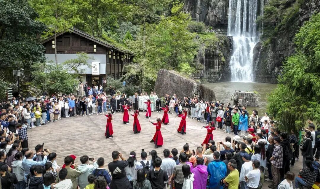 如果说生态护水是“打底”,那么文化活水则为景区注入灵魂。文成深挖水文化价值,打造“5A+武侠”特色IP,推出《侠影江湖》实景水幕演绎、武侠NPC互动等沉浸式体验,还原《少年歌行》等剧取景地,设置20余处沉浸场景。“伯温治水研学线”则以瀑布为讲堂,解读刘伯温“治国如治水”思想,实现水文化增值。