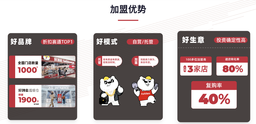 关于“部分城市新加盟叫停”的说法,好特卖方面表示加盟节奏确有“主动放缓”——这是好特卖稳步的发展策略,而非叫停加盟。目前好特卖加盟会在区域上更聚焦核心城市以积累品牌势能,同时供应链半径和管理半径也更短。
