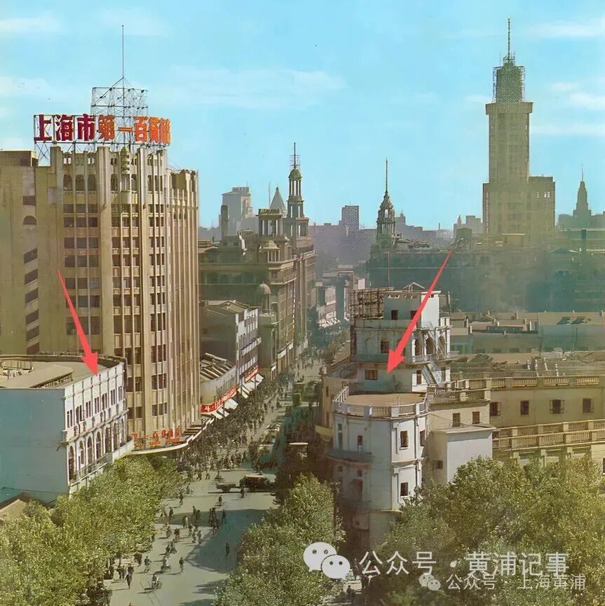 解放前南京西路东望,箭头处为新世界南北楼(来源:魏斌)