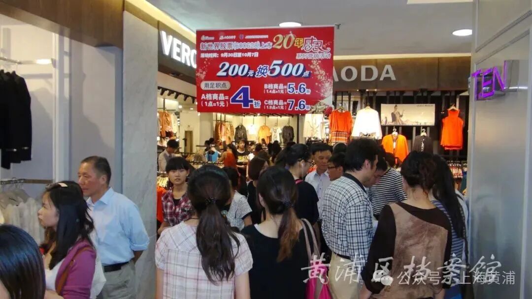 1995年12月30日,新世界城建成开业,投资逾10亿元,总面积近7.5万平方米,地上12层,地下2层,成为浦西地区最大的单体商厦,1990年代上海“三年大变样”的标志性景观。开业当天,万人空巷,大楼每15秒钟约500多人次进门,每5分钟爆满一个楼面,不得不向外疏散人流,最后采取提前关门的措施应对。