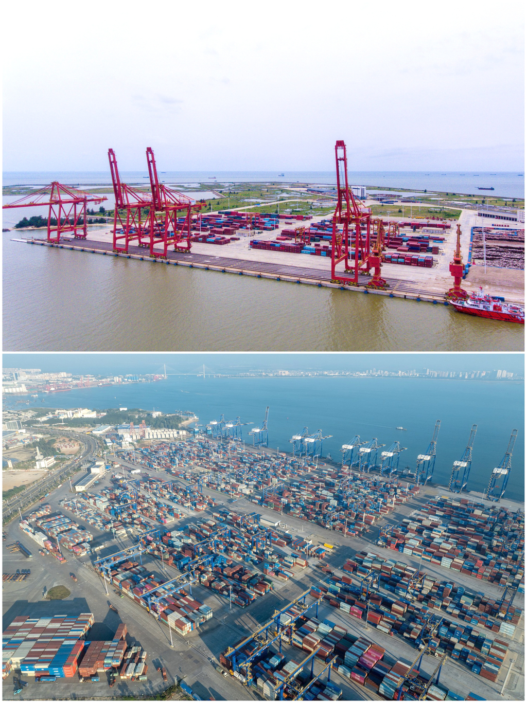 上图:2018年8月7日的洋浦小铲滩集装箱码头;下图:2025年12月17日的洋浦国际集装箱码头(原洋浦小铲滩集装箱码头)。