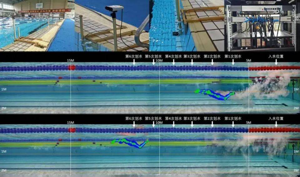 水下模块则是在全长50米的泳池里,部署了16个高精度的水下相机,对途中游、转身、冲刺等水下环节进行数据记录,包括各个点位的速度、划频、划幅等,精准地与运动员的训练目标进行对比。