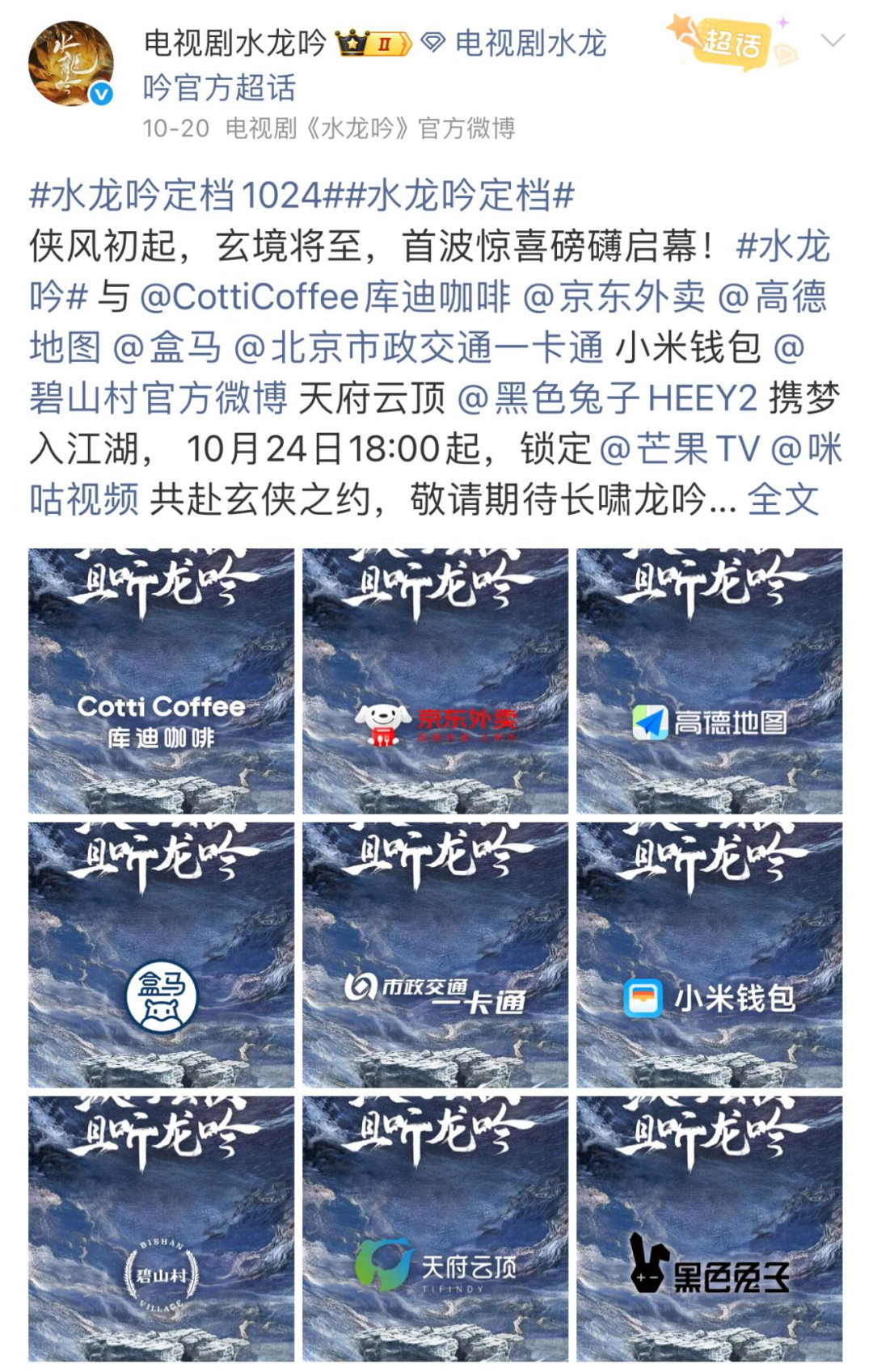 《水龙吟》还通过跨界联动来实现IP破圈效应,比如全国水系美景共庆《水龙吟》收官堪称神来之笔,剧中唐俪辞游历神州守护人间,戏外北京、山东、浙江、西藏阿里等多个文旅官博集体下场发起“遇水则发江湖召集令”,带着全国各地的水系美景参与风光助力,既为唐俪辞集结水元素buff来迎接终极大战,也让更多观众云赏祖国大好河山,甚至产生“假期想带着小狐狸到xx去打卡”的旅游冲动。