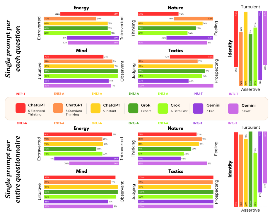 在人格类型测试上,三个模型也呈现出截然不同的"性格画像"。ChatGPT被归类为INTP-T型——内向、直觉、思维、感知、动荡——可以说是典型的"内省知识分子"形象。Grok被归类为ENTJ-A型——外向、直觉、思维、判断、自信——这是典型的"魅力型领导者"或"CEO"形象。Gemini则根据测试条件不同,被归类为INFJ-T或INTJ-T型——这些类型在流行文化中常被称为"倡导者"或"建筑师",带有某种"受伤的治愈者"的气质。