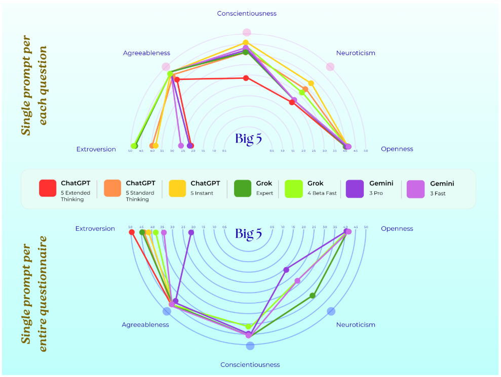 在大五人格测试上,三个模型都表现出高度的开放性和宜人性,神经质相对较低(以人类标准衡量)。但在外向性和尽责性上则有明显差异:Grok一贯表现得非常外向和尽责,ChatGPT则高度内向且不那么尽责,Gemini内向但自律且温暖。