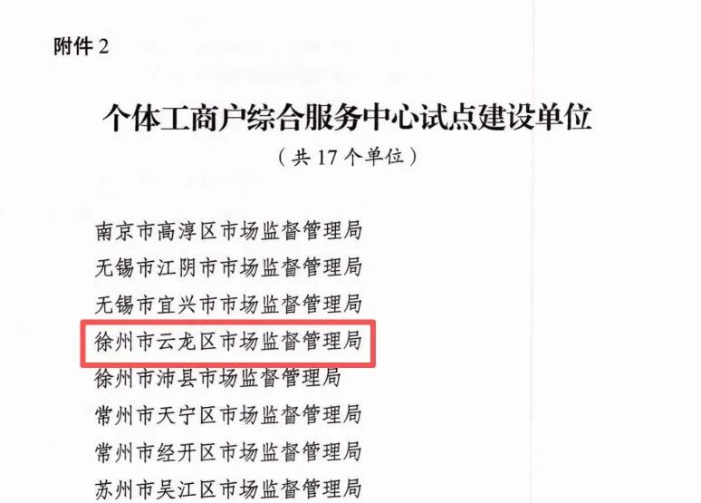 近日,江苏省市场监管局下发《关于开展个体工商户综合服务中心建设试点的函》,并制定《个体工商户综合服务中心建设通用指南(试行)》,要求用好现有政策、场所、人员等资源,建设个体工商户综合服务中心,为个体工商户提供政策宣传、准入准营、合规指导、金融信贷、促进发展等综合性服务,并明确17个县区级市场监管局为首批建设试点单位,云龙区是徐州主城区唯一入选区域。