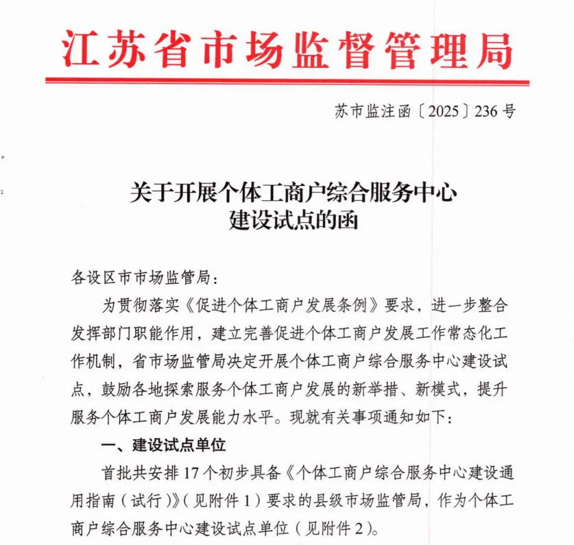 个体工商户作为市场主体的“毛细血管”,是稳经济、稳就业、惠民生的重要支撑。随着全省经济向高质量发展转型,个体工商户普遍面临经营规模小、抗风险能力弱、转型升级慢等共性问题,亟需系统化、精准化的综合服务体系保驾护航。在此背景下,江苏省启动个体工商户综合服务中心建设试点,目的就是通过试点先行、以点带面,探索可复制、可推广的个体工商户扶持模式,打通政策落地“最后一公里”,为全省个体经济发展注入新动能。