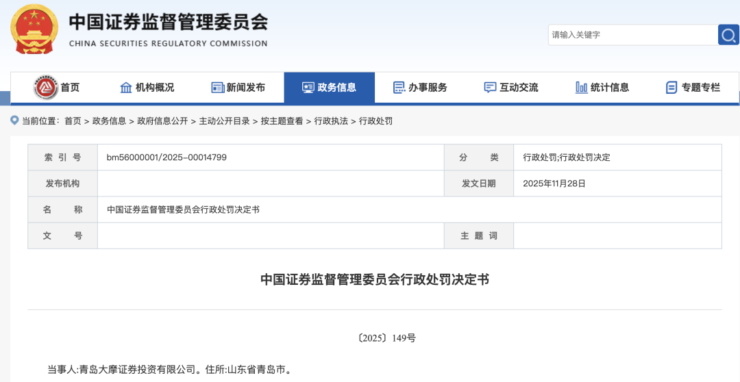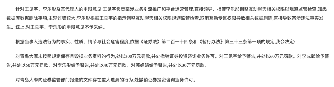 12月19日,中国证监会官网公布的行政处罚决定书显示,中国证监会对青岛大摩证券投资有限公司处以300万元罚款,并处撤销证券投资咨询业务许可。同时,中国证监会对4名相关责任人给予警告,并分别处以60万元、50万元、40万元、30万元的罚款。
