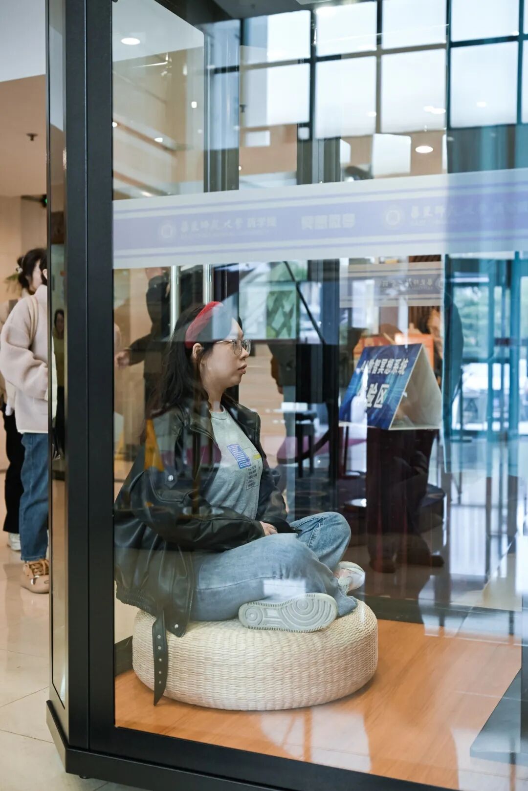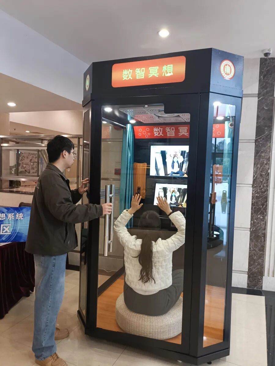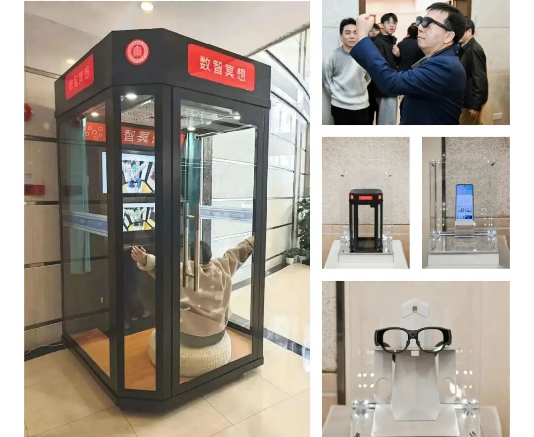 据介绍,系统采用“一套系统+ 三种产品形态”的布局:移动端APP用于伴随式训练,可识别冥想前状态、匹配节奏并生成个体化建议;AR冥想眼镜以沉浸式视觉与多模态信号联动,提升入静效率与专注体验;AI数智微厅以小型舱体承载采集、反馈与隐私空间,实现“即用即走”的沉浸训练,可部署于学校、社区、企业、医疗康养与公共服务场景,覆盖不同人群与需求。