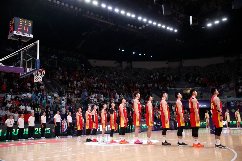 8月17日,在沙特阿拉伯吉达举行的2025国际篮联亚洲杯决赛中,中国队89比90不敌澳大利亚队,获得亚军。图为中国队球员在赛前奏唱国歌仪式上列队。新华社记者 王东震 摄