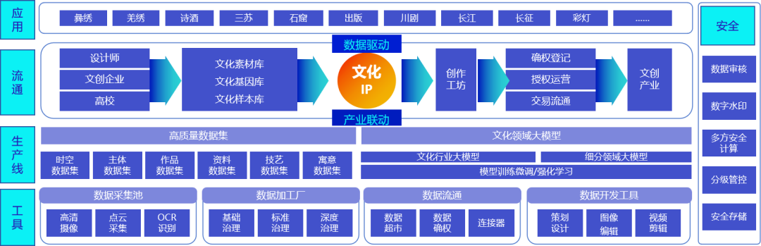 三是创新应用场景,让数据“用得好”。构建文化“行业通识+领域专识”数据集,用于训练行业大模型和领域大模型。以“双模驱动”为核心,围绕文物保护、文化传承与产业发展三大方向,打造文化数字化保护系统、AIGC剧游系统、文化数字(IP)创作工坊等创新应用,支撑非遗、文博、文艺等文化项目20余个,推动文化事业与产业融合发展。