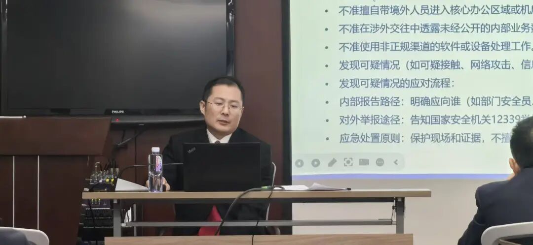 讲座伊始,徐贵友结合近期国内外安全形势与已披露的典型案例,深入剖析了当前境外间谍情报机关及敌对势力对我国金融领域渗透、策反、窃密活动的新动向与新特点。在“形势与法理”部分,系统梳理了《中华人民共和国反间谍法》《中华人民共和国刑法》《中华人民共和国数据安全法》等法律中的核心条款构成要件,详细阐明了个体一旦违法将面临的严厉刑事处罚、职业生涯中断以及个人与家庭声誉严重受损的多重后果。通过以案释法、敲响警钟,进一步筑牢“不敢犯、不能犯”的法律震慑根基。