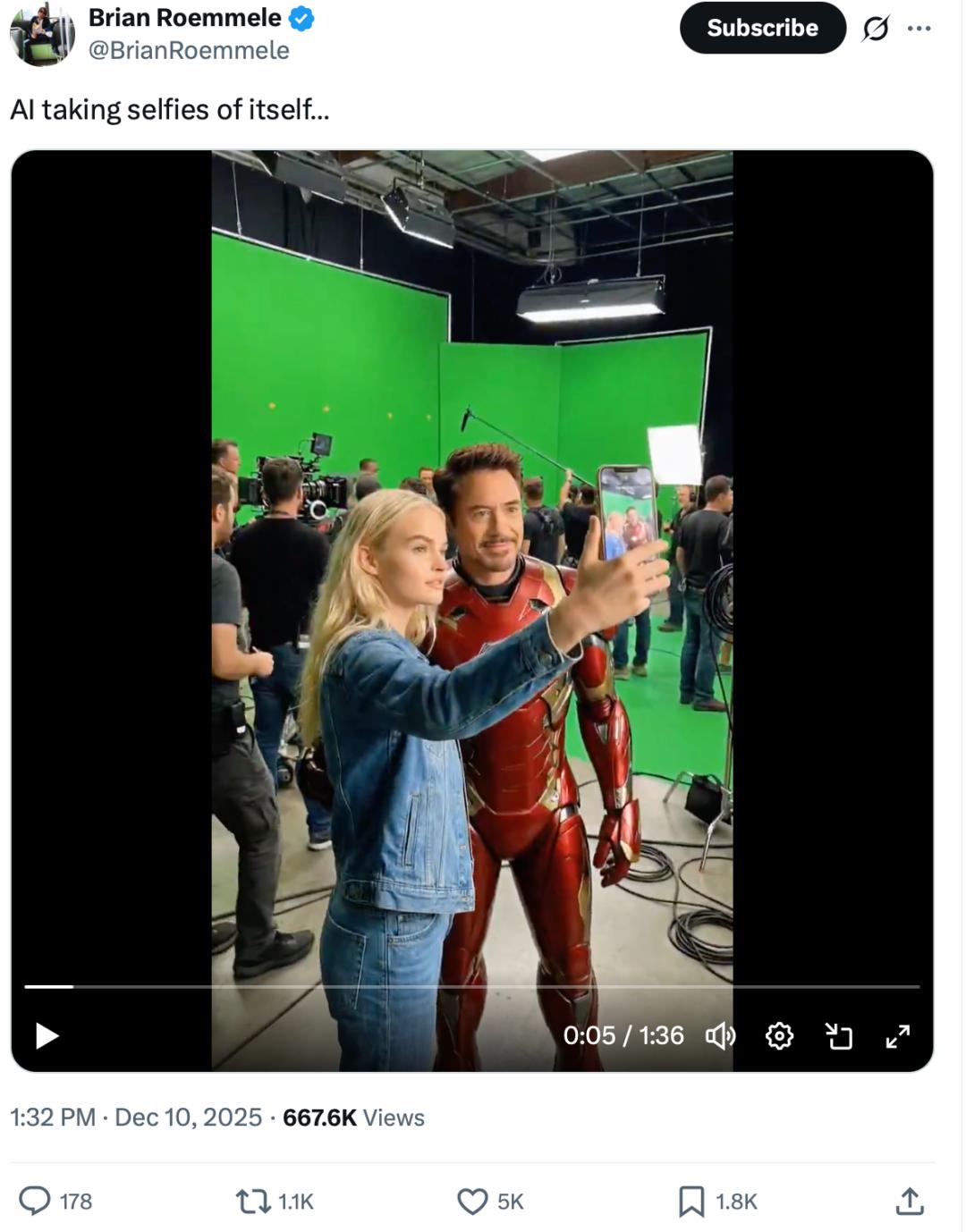 源头作者是被马斯克关注的科技博主Brian Roemmele,12月10日他在X上发布了第一段AI片场探班视频,目前已收获了超66万播放、5000+点赞、1100+转发。