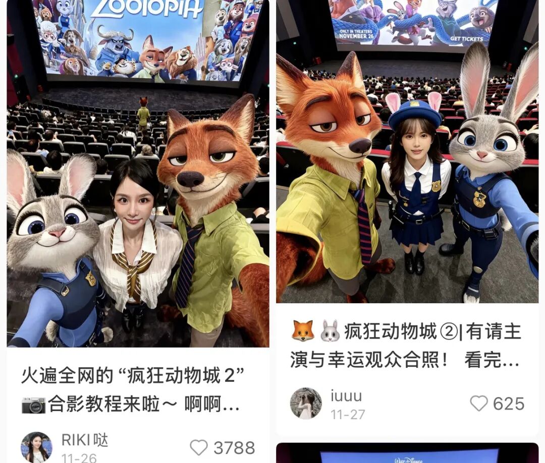 比如《疯狂动物城2》引发的“与狐兔AI合影”热潮,刷爆小红书、朋友圈、抖音等社交平台,热度压过一众品牌联名,成为电影上映期极具代表性的宣传案例。