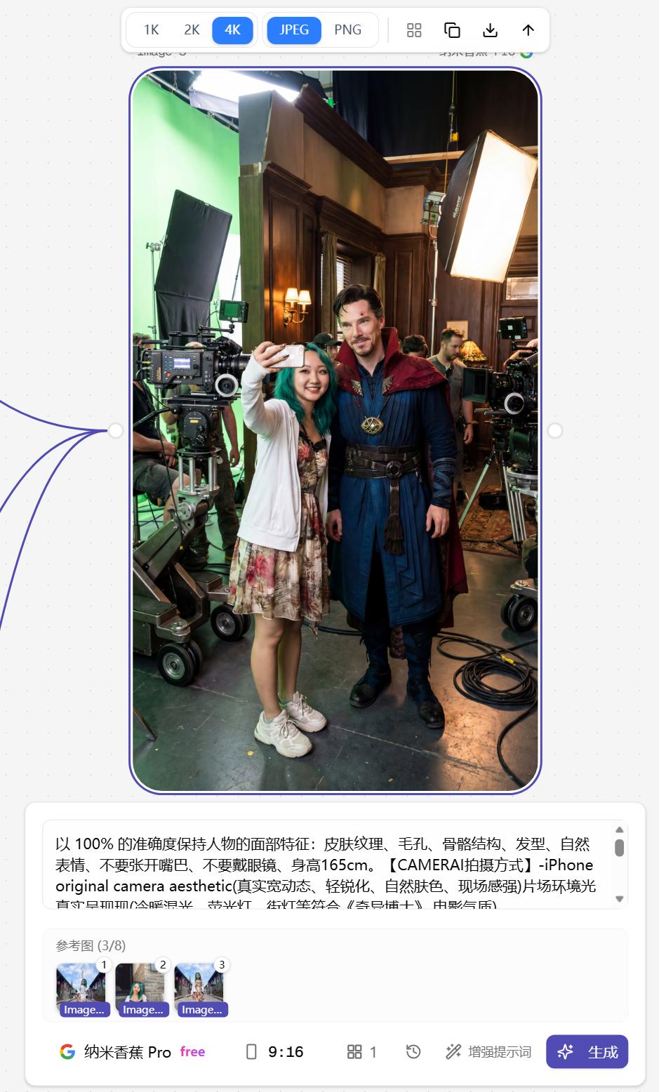 【MAIN ACTION|核心动作】-上传人物正在拍一张幕后合影-合影对象是"Stephen Strange"-Stephen Strange 必须完全呈现为“《奇异博士》(2016)”中的角色造型。拍摄时期的年龄与面部线条Stephen Strange的妆容帅气自信,标志性的酒红色魔法斗篷、蓝色法袍、胸前挂着阿戈摩托之眼。Stephen Strange的体态自然优雅,气质·表情真实,不要夸张卡通,而是电影中的自信、微妙笑意-场面要实现为:→电影正在拍摄→摄影师誠停→Stephen Strange 暂时走出角色与上传人物合影→表情自然、不正式,像是"你想来一张吗?"的轻松瞬间。