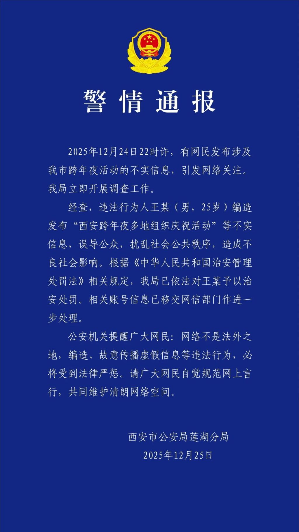 西安莲湖警方:一男子编发“跨年夜多地组织庆祝活动”不实信息被处罚