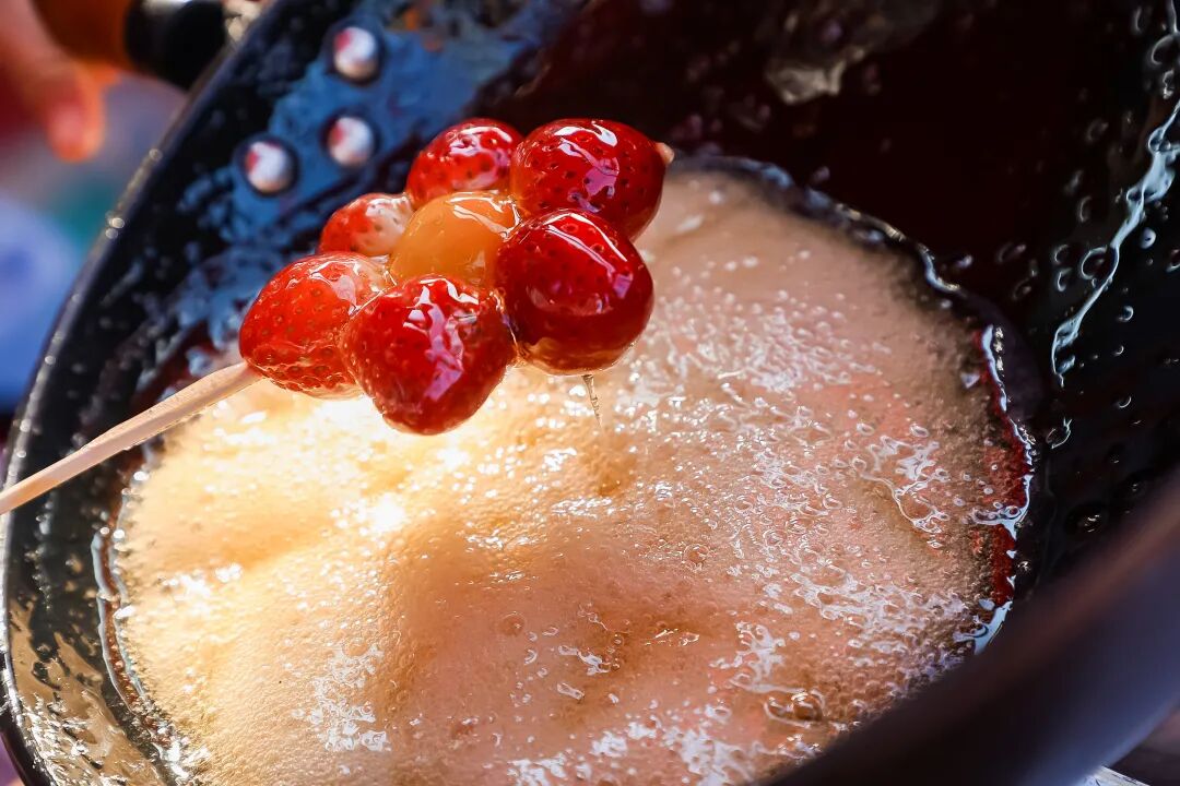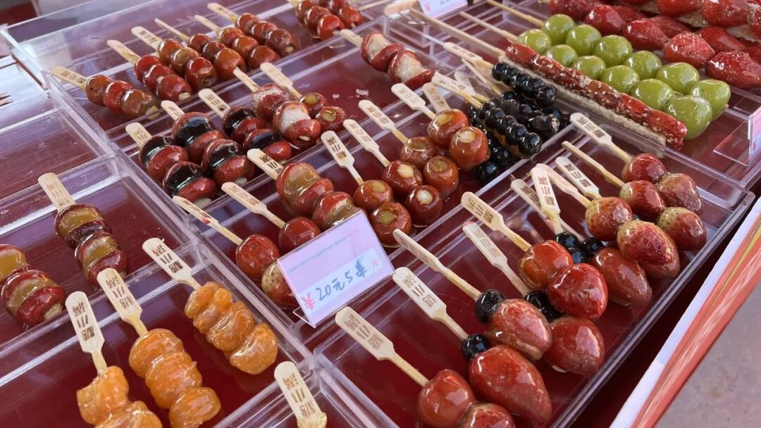 除了直接享用,用新鲜草莓现做的冰糖葫芦无疑成了市集上最受欢迎的“网红单品”。一颗颗鲜红的草莓裹上清透的糖壳,在阳光下闪闪发光,颜值与美味并存。许多年轻人举着它一边品尝酸甜的滋味,一边与工业风的背景合影,构成了冬日里一道别致的风景线。