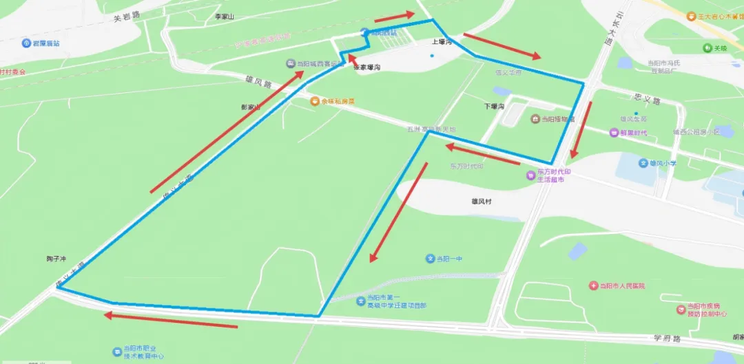 高铁当阳西站门前广场(起点)—西站路—忠义大道—云长大道—雄风路—体育馆路—学府路—信义大道—高桥路—高铁当阳西站门前广场(终点),全长5公里。