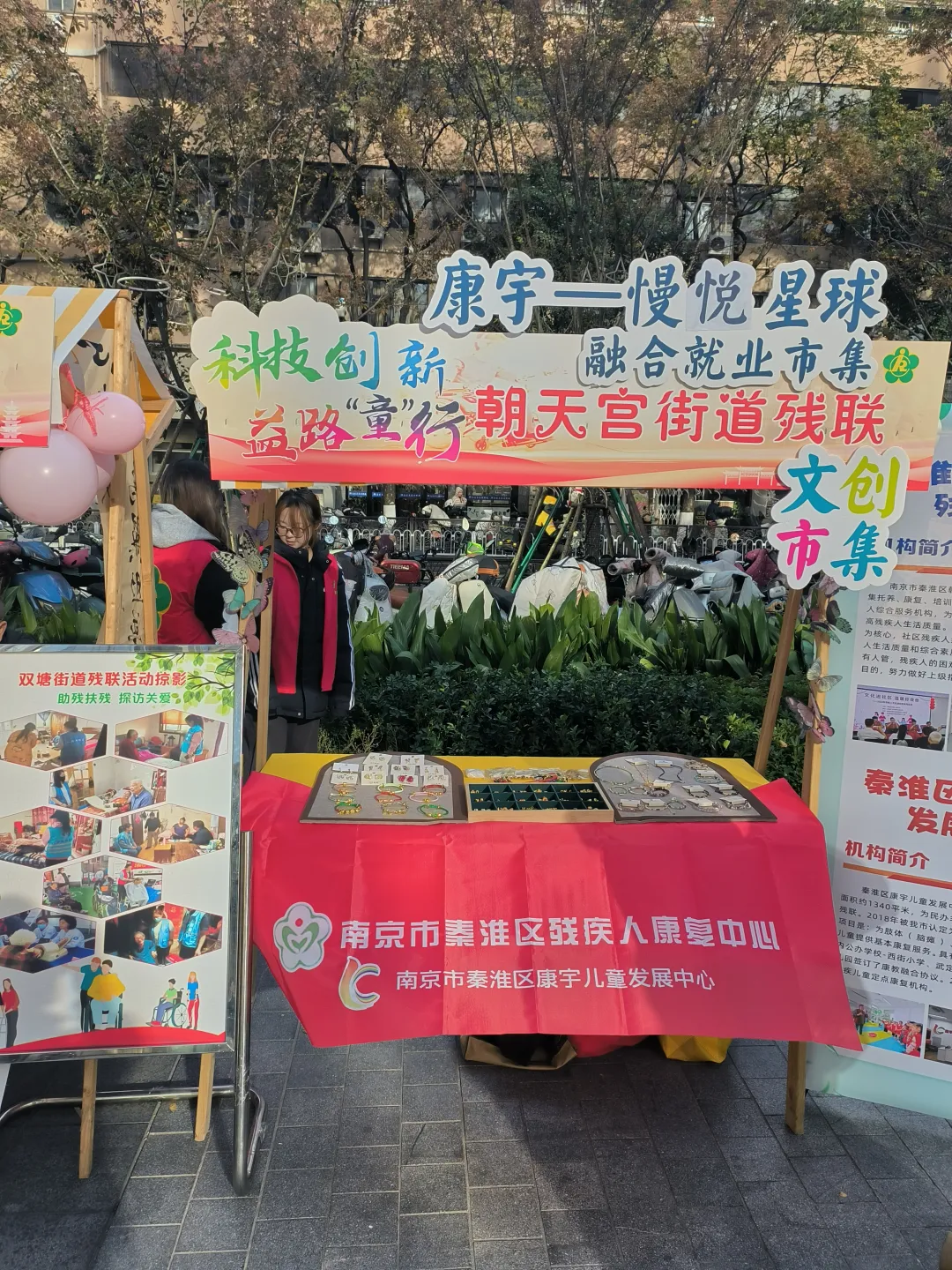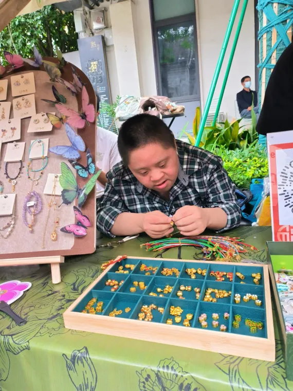 南京熙南里创业市集“康宇-慢悦星球融合就业市集”的招牌下,何程,一位37岁的唐氏综合症患者,低着头,一颗一颗地将珠子穿进绳子。