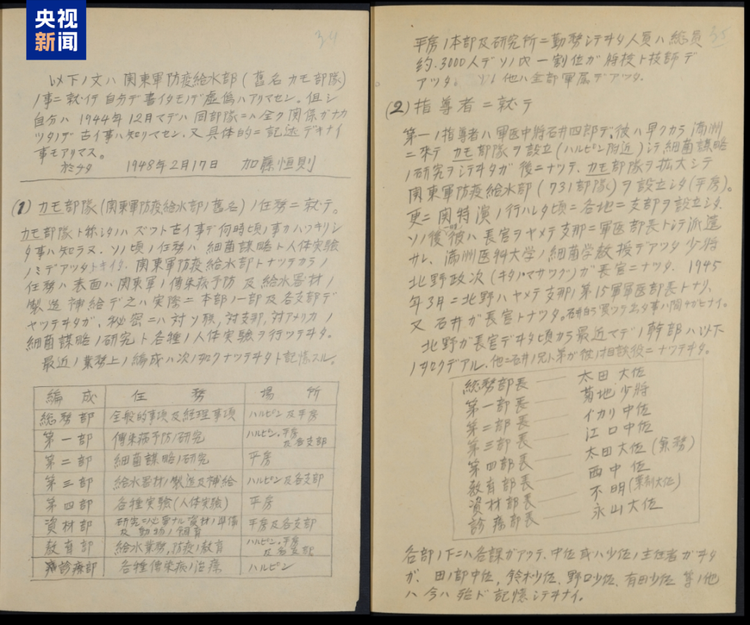 近日,侵华日军第七三一部队罪证陈列馆公布一份题为《731部队海拉尔支部部队长加藤恒则笔供》的史料。