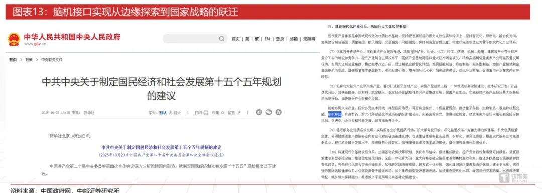真正的战略级信号出现在三个月后。《中共中央关于制定国民经济和社会发展第十五个五年规划的建议》正式发布,将“脑机接口”明确列为未来产业六大方向之一。这意味着,脑机接口不再仅仅是科技界关注的“前沿技术”,而是与国家长期竞争力紧密绑定的“战略棋子”,其产业地位获得了最高层次的确认。
