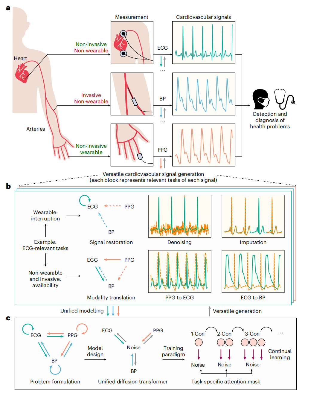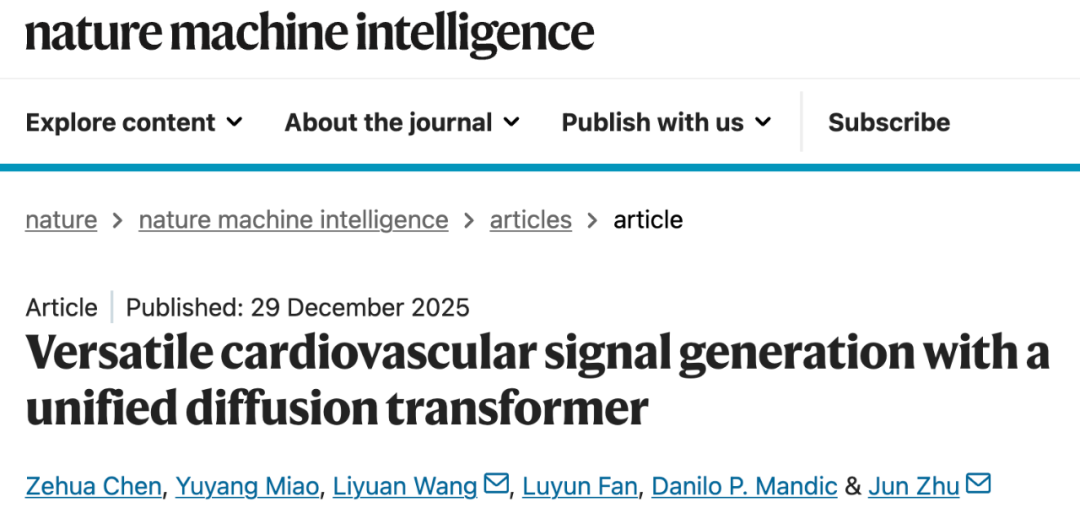 2025 年 12 月 29 日,清华大学朱军、王立元等,在 Nature 子刊 Nature Machine Intelligence 上发表了题为:Versatile cardiovascular signal generation with a unified diffusion transformer 的研究论文。