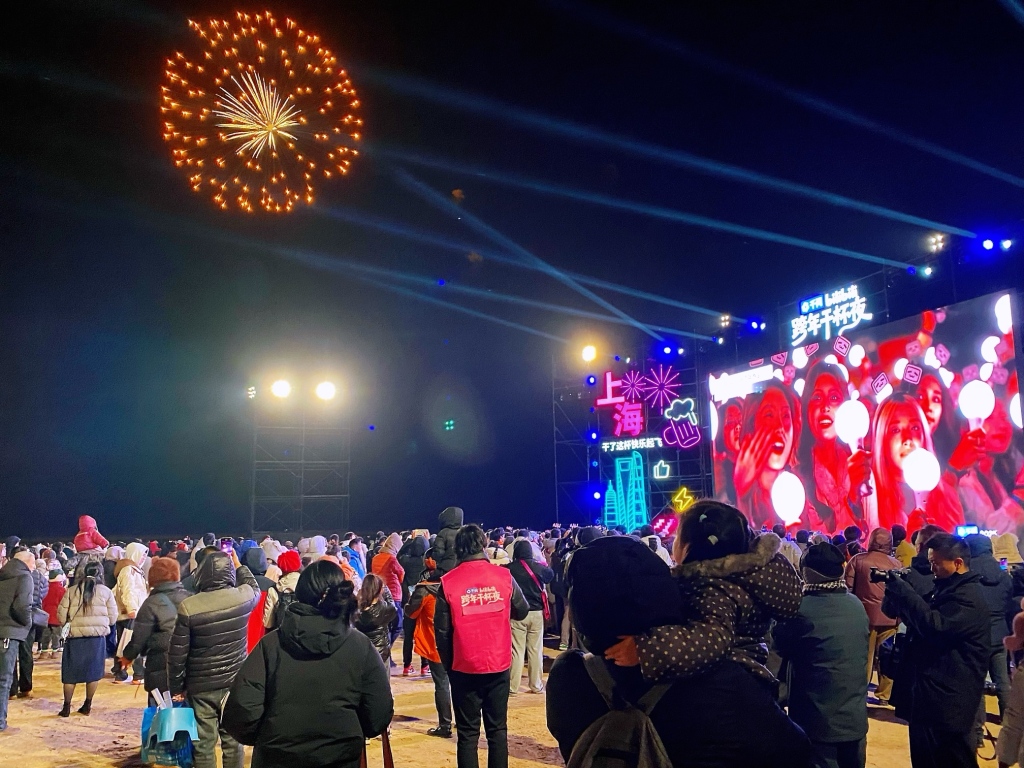 12月31日晚,以“东风夜放花千树”迎新烟花秀、“bilibili跨年干杯夜”和无人机表演为特色的金山滨海跨年迎新活动在上海市金山城市沙滩举行。据主办方估计,入场人数超过6000人次。尽管天气寒冷,但沙滩上的篝火为人们带来了不一样的温暖。