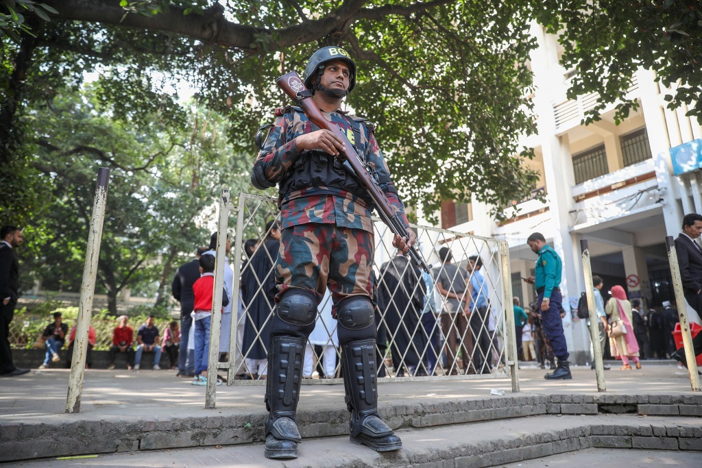 当地时间2025年12月1日,孟加拉国达卡,一名孟加拉国边防卫队成员在达卡大都会法院区域站岗。达卡一家法院于12月1日判处孟加拉国前总理谢赫·哈西娜五年监禁,谢赫·雷哈娜七年监禁,其女儿、英国议员西迪克两年监禁,罪名是首都发展局(RAJUK)地块分配违规。 视觉中国 图