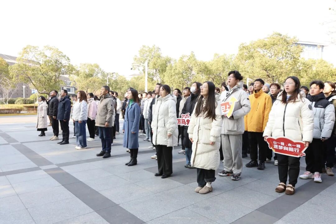 国歌奏响,全场肃立。五星红旗在晨曦中冉冉升起,全场师生肃立,目光追随,歌声嘹亮,表达对祖国的深厚情感与崇高敬意。这一刻,不仅是新年的开始,更是全体海大人携手启航的庄严宣誓。