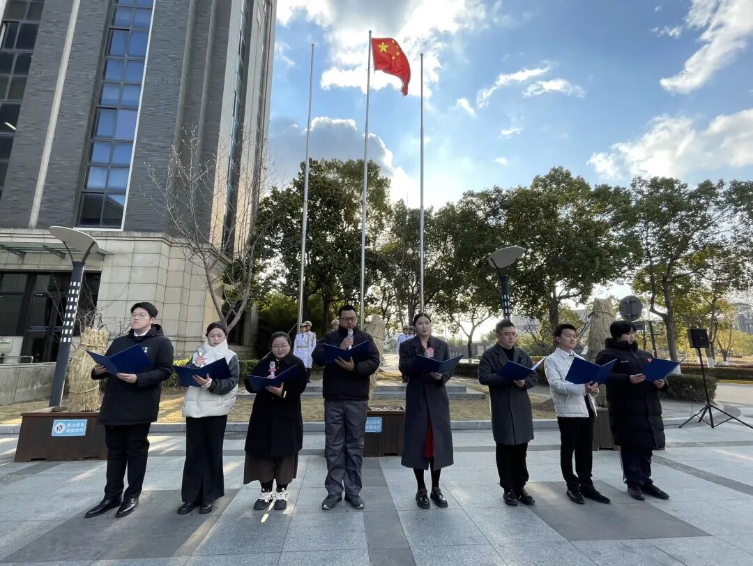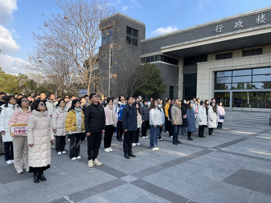 新年伊始,晨光初绽。2026年1月2日,上海海洋大学在临港校区行政楼广场上举行元旦升旗仪式,师生代表近百人参与此次活动。